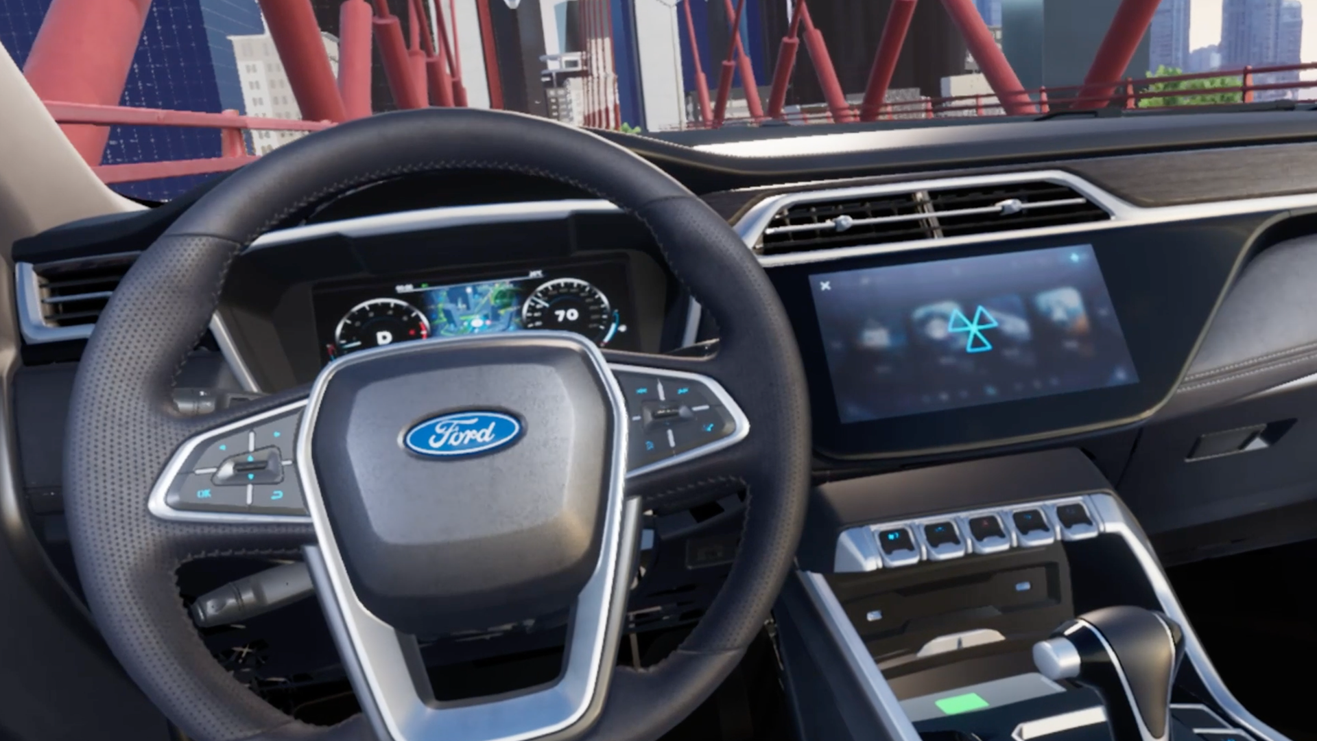 We wanted to create a scene that matched the Territory's audience group, a city dweller who enjoys the occasional journey but is more interested in the smart technology and space inside the car. As the Ecosport was in a city environment and the Kuga was in a rural area, I decided a bridge scene would offer the perfect opportunity to narratively fit in as well as offer the opportunity to see stunning scenery in VR. The Territory would drive across the bridge with the V/O talking about the spacious interior. From there a UI graphic will appear, rotating through the three dashboard designs.
